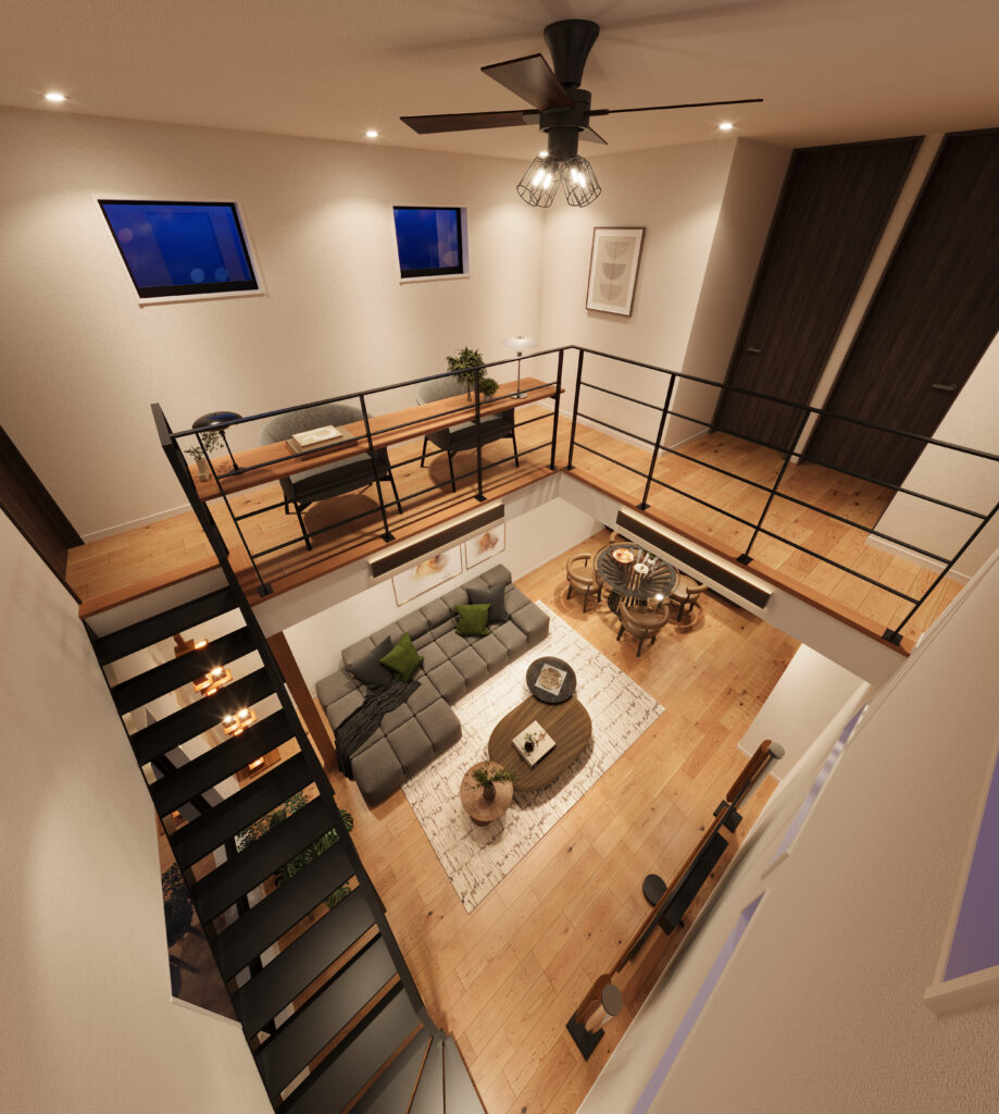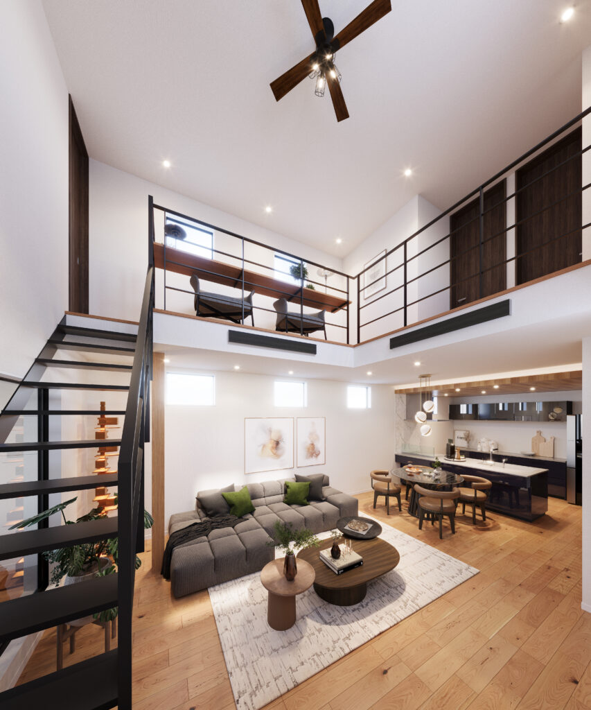 耐震等級3+制振セットの高耐震デザイナーズ住宅/高気密、高断熱だから出来る吹き抜けのあるリビング
