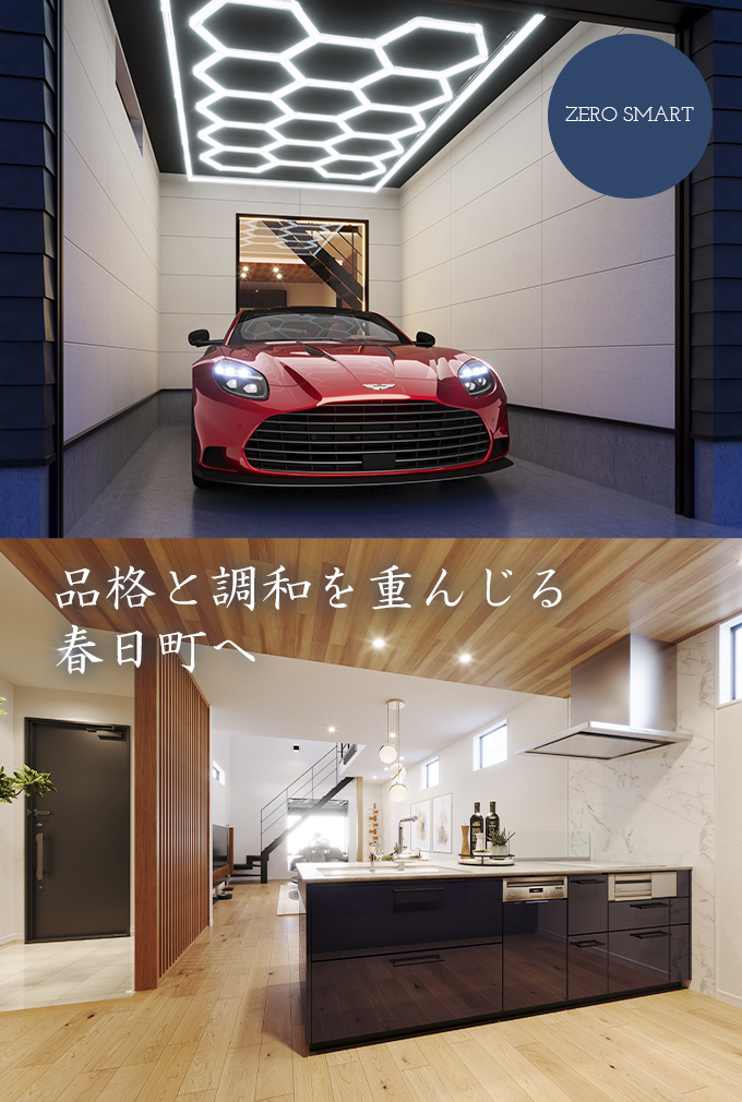 シャッター付きガレージと高性能住宅が融合し、大切な愛車を守りながら、家族と快適な日常を紡ぐ。断熱・気密・耐震に優れたZEH基準の住まいが、心地よい空間を実現。愛車と共に暮らす歓びを、堪能できる邸宅です。